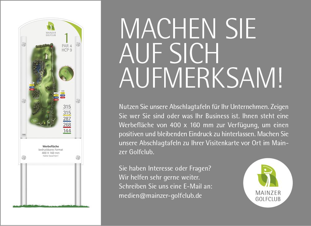 Der Mainzer Golfclub bietet eine ideale Plattform, um Ihr Unternehmen zu präsentieren. Über 1.400 Mitglieder und mehr als 6.500 Gastrunden pro Jahr sprechen für die immer größer werdende Beliebtheit unseres Platzes und unseres Clubs. Im Rahmen unseres Partnerprogramms offerieren wir Ihnen vielfältige Werbemöglichkeiten, z.B.: